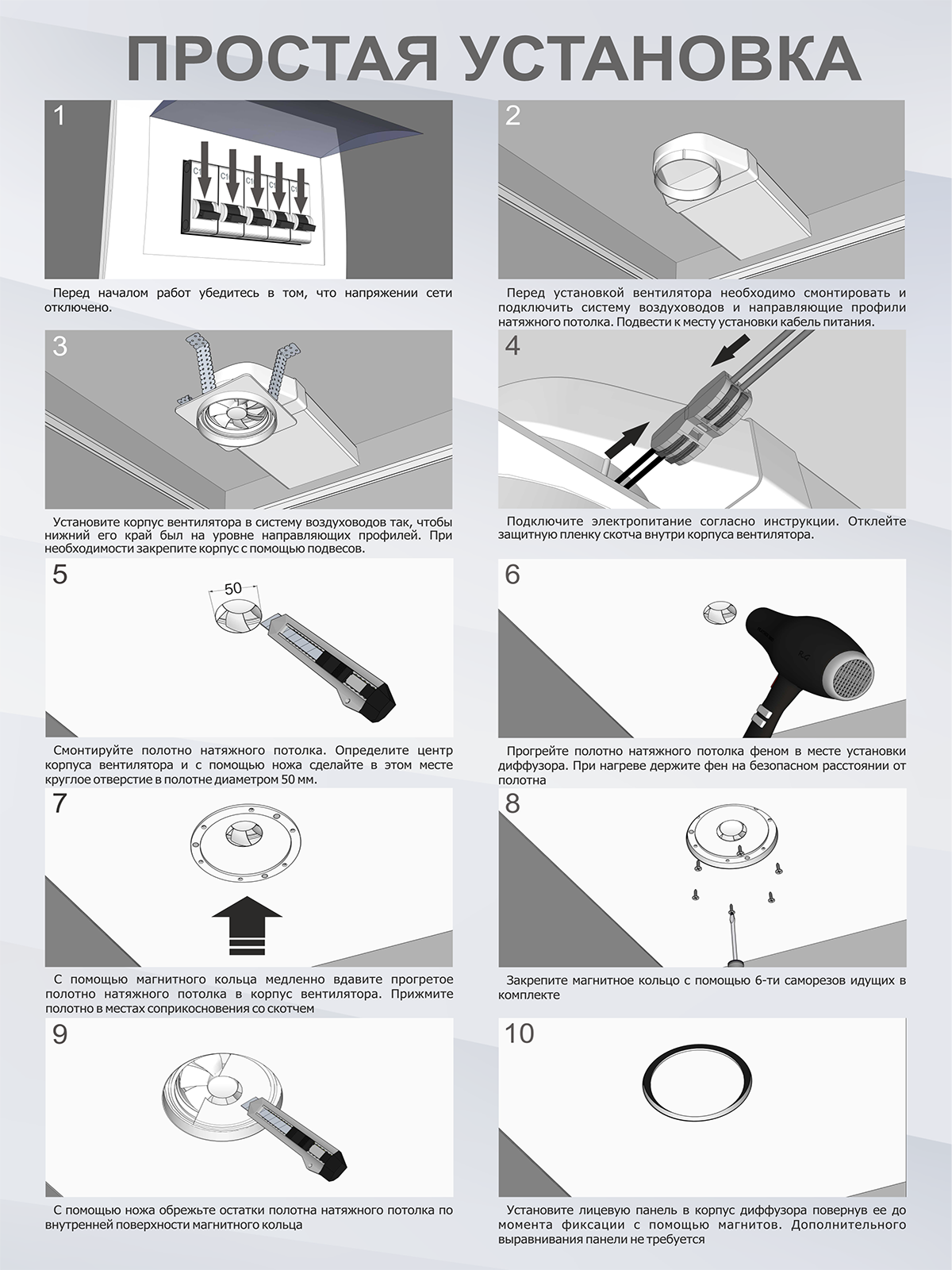 Вентилятор FAN легко снять и поставить обратно, для этого не требуется разбирать потолок: корпус диффузора остается на месте. Через года, когда придет время менять вентилятор – Вы всегда сможете приобрести у нас новый, ресурс мотора 50 000 часов.