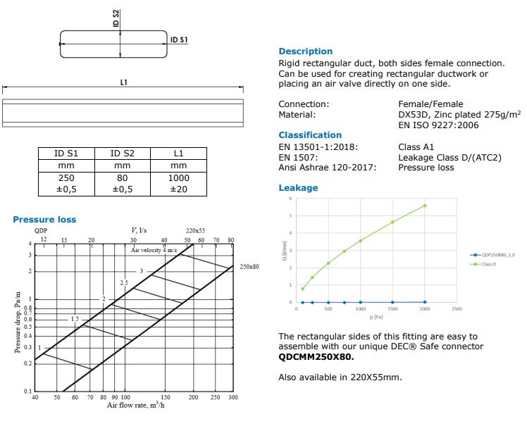 Воздуховод 250х80мм 1,0м F/F QuadroDEC QDP250x80/1.0